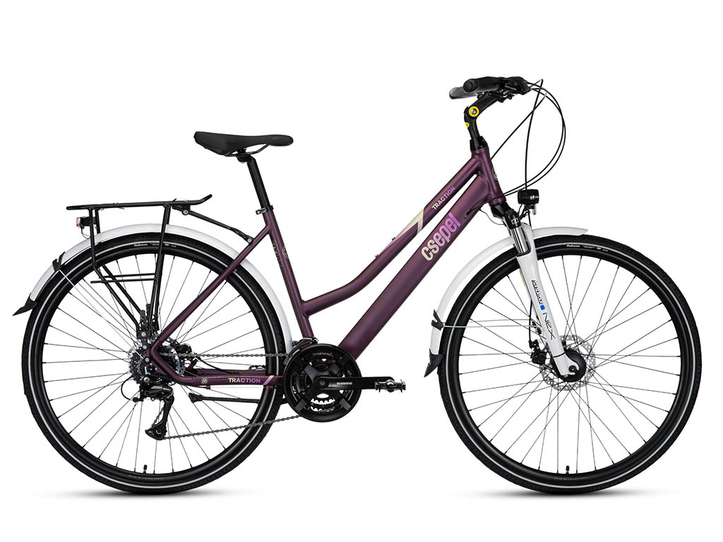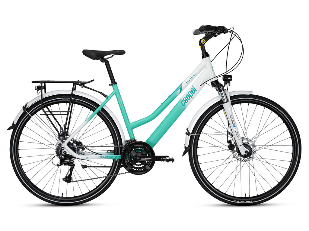 A Csepel Traction női alu vázas túra kerékpárok mind városi, mind túrázós bringások számára jó választás. A Traction női család 28" kerék mérettel készül 17 és 19 colos alu vázzal, aminek hajtás rendszere láncváltós 21 sebességes kivitelben, több színben is elérhető. Felszereltségük teljes kresz és kényelmi tartozékokkal van felvértezve mint lámpák, prízmák, csengő, csomagtartó, sárvédő, kitámasztó. A trc 200-as változata Shimano agydinamót tartalmaz az első agyban és a világítás innen kapja az energiát.